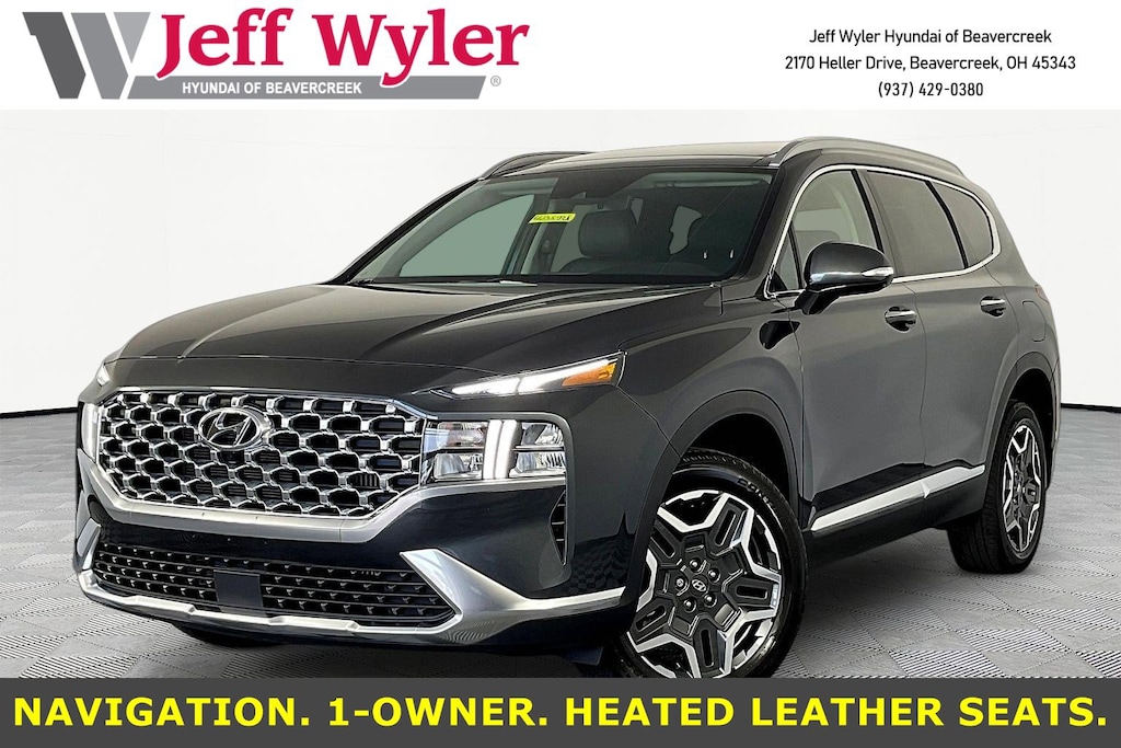 CARFAX One-Owner. Jeff Wyler Hyundai of Beavercreek is pumped up to offer this fantastic 2023 Hyundai Santa Fe Hybrid SEL Premium in Portofino Gray. Well equipped with: Option Group 01, 12 Speakers, 3.510 Axle Ratio, 4-Wheel Disc Brakes, ABS brakes, Air Conditioning, Alloy wheels, AM/FM radio: SiriusXM, Apple CarPlay & Android Auto, Auto High-beam Headlights, Auto-dimming Rear-View mirror, Automatic temperature control, Brake assist, Bumper Applique, Bumpers: body-color, Cargo Cover/Screen, Cargo Net, Cargo Tray, Carpeted Floor Mats, Delay-off headlights, Driver door bin, Driver vanity mirror, Dual front impact airbags, Dual front side impact airbags, Electronic Stability Control, Emergency communication system, Exterior Parking Camera Rear, First Aid Kit, Four wheel independent suspension, Front anti-roll bar, Front Bucket Seats, Front Center Armrest, Front dual zone A/C, Front reading lights, Fully automatic headlights, Garage door transmitter: HomeLink, H-Tex Leatherette Seat Trim, harman/kardon® Speakers, Heated door mirrors, Heated Front Bucket Seats, Heated front seats, Illuminated entry, Leather steering wheel, Low tire pressure warning, Mudguards, Navigation System, Occupant sensing airbag, Outside temperature display, Overhead airbag, Overhead console, Panic alarm, Passenger door bin, Passenger vanity mirror, Power door mirrors, Power driver seat, Power Liftgate, Power moonroof, Power passenger seat, Power steering, Power windows, Radio: AM/FM Harman Kardon Audio, Rear anti-roll bar, Rear seat center armrest, Rear window defroster, Rear window wiper, Remote keyless entry, Security system, Speed control, Speed-sensing steering, Split folding rear seat, Spoiler, Steering wheel mounted audio controls, Tachometer, Telescoping steering wheel, Tilt steering wheel, Traction control, Trip computer, Turn signal indicator mirrors, Variably intermittent wipers, Wheel Locks, and Wheels: 19" x 7.5J Alloy.Come see the excitement at Jeff Wyler Hyundai of Beavercreek! Visit us online at www.jeffwylerhyundaiofbeavercreek.com Proudly Serving: Cincinnati, Dayton, Centeville, Ketttering, Moraine,Beavercreek, Xenia,Oakwood, Trotwood, Vandalia, Kettering, Wright Patterson, Riverside, Engelwood, Miamisburg, Huber Heights, Springboro, Brookville, Fairborn, West Carrollton, Yellow Springs, Bellbrook, Springfield Columbus, Hamilton, West Chester, Monroe, Fairfield. PROUDLY SERVING: CINCINNATI, DAYTON,COLUMBUS, LOUISVILLE, LEXINGTON, INDIANAPOLIS,HAMILTON, FLORENCE, ALEXANDRIA, BEAVERCREEK, SPRINGDALE, WEST CHESTER, MONROE, FAIRFIELD, KENWOOD, NEWPORT AND ALL OF GREATER CINCINNATI OHIO, INDIANA, AND NORTHERN KENTUCKY.