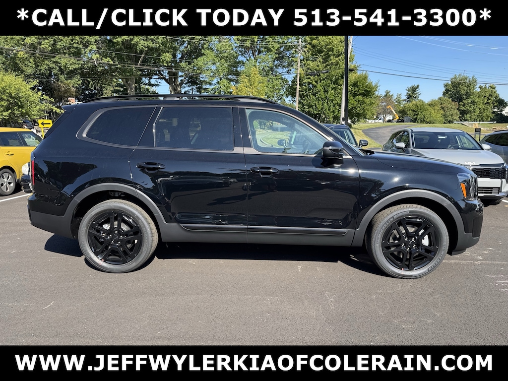 Jeff Wyler Kia of Colerain is very proud to offer this charming-looking 2025 Kia Telluride EX X-Line in Ebony Black. 3rd row seats: split-bench, 4-Wheel Disc Brakes, 6 Speakers, ABS brakes, Air Conditioning, Alloy wheels, AM/FM radio: SiriusXM, Apple CarPlay & Android Auto, Auto High-beam Headlights, Auto-dimming Rear-View mirror, Auto-leveling suspension, Automatic temperature control, Brake assist, Bumpers: body-color, Carpeted Floor Mats, Compass, Delay-off headlights, Driver door bin, Driver vanity mirror, Dual front impact airbags, Dual front side impact airbags, Electronic Stability Control, Emergency communication system: 911 Connect, Exterior Parking Camera Rear, Folding Cargo Tray, Four wheel independent suspension, Front anti-roll bar, Front Bucket Seats, Front Center Armrest, Front dual zone A/C, Front reading lights, Fully automatic headlights, Heated & Ventilated Front Bucket Seats, Heated door mirrors, Heated front seats, Heated steering wheel, Illuminated entry, Knee airbag, Leather Seat Trim, Leather Shift Knob, Leather steering wheel, Low tire pressure warning, Navigation System, Occupant sensing airbag, Outside temperature display, Overhead airbag, Overhead console, Panic alarm, Passenger door bin, Passenger vanity mirror, Power door mirrors, Power driver seat, Power Liftgate, Power moonroof, Power passenger seat, Power steering, Power windows, Radio data system, Radio: AM/FM Display Audio System, Rear air conditioning, Rear anti-roll bar, Rear audio controls, Rear reading lights, Rear side impact airbag, Rear window defroster, Rear window wiper, Reclining 3rd row seat, Remote keyless entry, Security system, Speed control, Speed-sensing steering, Split folding rear seat, Spoiler, Steering wheel mounted audio controls, Tachometer, Telescoping steering wheel, Tilt steering wheel, Traction control, Trip computer, Turn signal indicator mirrors, Variably intermittent wipers, Ventilated front seats, and Wheels: 20" x 7.5" Black Finish X-LINE Exclusive Our PRE-OWNED vehicles are put through a rigorous 167- POINT QUALITY ASSURANCE INSPECTION along with an average amount of over $1,400.00 SPENT to recondition each vehicle so we can be sure to deliver you the highest quality vehicle like you deserve! ***ONLINE PRICE DOES NOT INCLUDE WYLER FAMILY FIRST PACKAGE***