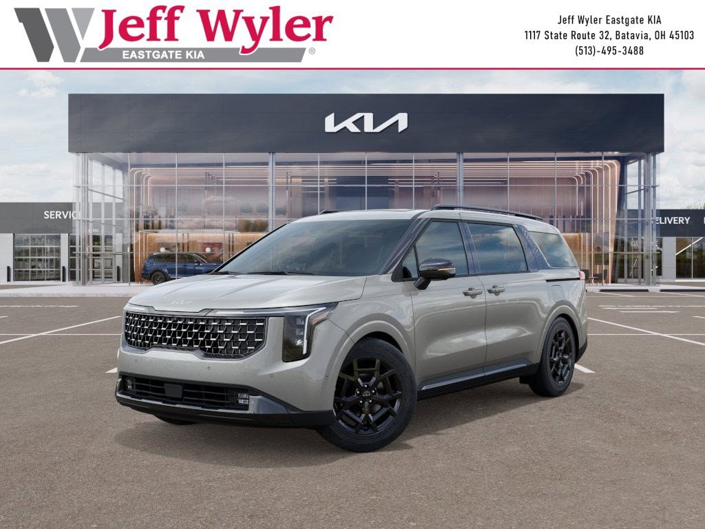 Ivory Silver 2026 Kia Carnival SX V6 FWD 8-Speed Automatic 18/26 City/Highway MPG Jeff Wyler Eastgate Auto Mall is honored to offer this good-looking 2026 Kia Carnival SX in Ivory Silver. Well equipped with: SX Dark Edition Package (Wheels: 7.5J x 19" Alloy Dark Edition), 3.51 Axle Ratio, 3rd row seats: split-bench, 4-Wheel Disc Brakes, 8 Speakers, ABS brakes, Air Conditioning, All Weather Floor Mats (8-Passenger), Alloy wheels, AM/FM radio: SiriusXM, Apple CarPlay & Android Auto, Artificial Leather Seat Trim, Auto High-beam Headlights, Auto-Dimming Mirror with HomeLink, Automatic temperature control, Brake assist, Bumpers: body-color, Compass, Dark Edition Front Grille Trim, Dark Edition Mirror Caps, Delay-off headlights, Driver door bin, Driver vanity mirror, Dual front impact airbags, Dual front side impact airbags, Electronic Stability Control, Emergency communication system, Exterior Parking Camera Rear, Four wheel independent suspension, Front anti-roll bar, Front Bucket Seats, Front Center Armrest, Front dual zone A/C, Front fog lights, Front reading lights, Fully automatic headlights, Heated and Ventilated Front Bucket Seats, Heated door mirrors, Heated front seats, Illuminated entry, Knee airbag, Leather Shift Knob, Leather steering wheel, Low tire pressure warning, Memory seat, Navigation System, Occupant sensing airbag, Outside temperature display, Overhead airbag, Overhead console, Panic alarm, Passenger door bin, Passenger vanity mirror, Power 2nd-Row Moonroof, Power door mirrors, Power driver seat, Power Liftgate, Power moonroof, Power passenger seat, Power steering, Power windows, Radio: AM/FM/HD Audio System, Rain sensing wipers, Rear air conditioning, Rear anti-roll bar, Rear reading lights, Rear window defroster, Rear window wiper, Reclining 3rd row seat, Remote keyless entry, Security system, Speed control, Speed-sensing steering, Split folding rear seat, Spoiler, Steering wheel mounted audio controls, Tachometer, Telescoping steering wheel, Tilt steering wheel, Traction control, Trip computer, Turn signal indicator mirrors, Variably intermittent wipers, Ventilated front seats, and Wheels: 7.5J x 19" Black Alloy. 18/26 City/Highway MPG