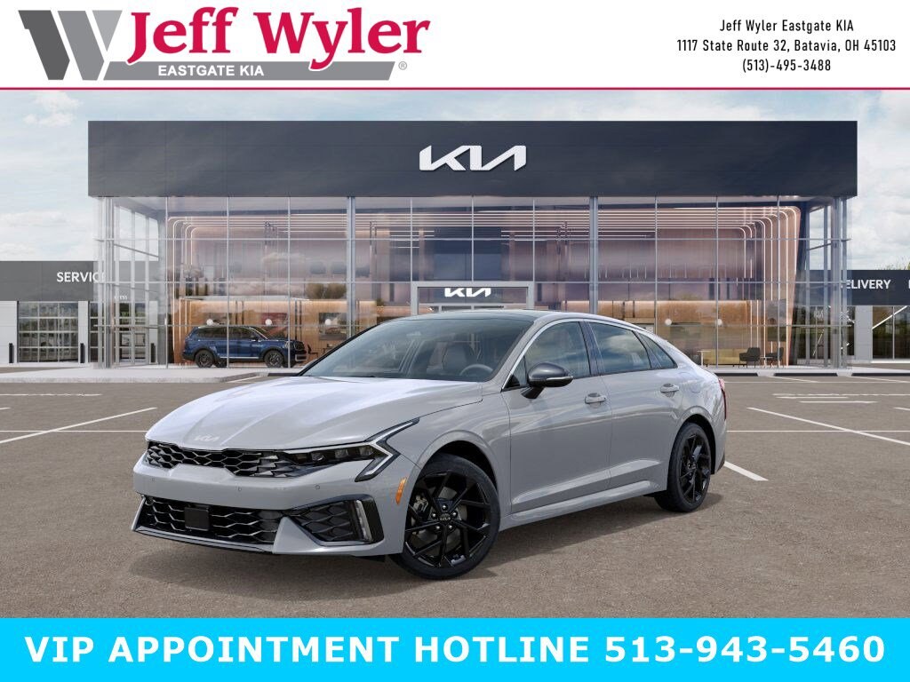 Wolf Gray 2026 Kia K5 GT-Line I4 AWD 8-Speed Automatic 24/33 City/Highway MPG Jeff Wyler Eastgate Auto Mall is pumped up to offer this gorgeous-looking 2026 Kia K5 GT-Line in Wolf Gray. Well equipped with: GT-Line Premium Package (Active Sound Design, Bose Premium Audio, LED Interior Lighting, Panoramic Sunroof, and Wheels: 18" x 7.5J Unique Gloss Black Alloy), 4-Wheel Disc Brakes, 6 Speakers, ABS brakes, Air Conditioning, Alloy wheels, AM/FM radio: SiriusXM, Apple CarPlay & Android Auto, Auto High-beam Headlights, Auto-Dimming Mirror with HomeLink, Automatic temperature control, Brake assist, Bumpers: body-color, Carpeted Floor Mats, Delay-off headlights, Driver door bin, Driver vanity mirror, Dual front impact airbags, Dual front side impact airbags, Electronic Stability Control, Emergency communication system: Kia Connect (includes 1 year free trial), Four wheel independent suspension, Front anti-roll bar, Front Bucket Seats, Front Center Armrest, Front dual zone A/C, Front fog lights, Front reading lights, Fully automatic headlights, Heated door mirrors, Heated Front Bucket Seats, Heated front seats, Heated steering wheel, Illuminated entry, Knee airbag, Leather Shift Knob, Leather steering wheel, Low tire pressure warning, Navigation System, Occupant sensing airbag, Outside temperature display, Overhead airbag, Overhead console, Panic alarm, Passenger door bin, Passenger vanity mirror, Power door mirrors, Power driver seat, Power steering, Power windows, Radio data system, Radio: AM/FM Audio System, Rear anti-roll bar, Rear seat center armrest, Rear side impact airbag, Rear window defroster, Remote keyless entry, Security system, Speed control, Speed-sensing steering, Split folding rear seat, Sport steering wheel, Steering wheel mounted audio controls, Tachometer, Telescoping steering wheel, Tilt steering wheel, Traction control, Trip computer, Turn signal indicator mirrors, Variably intermittent wipers, and Wheels: 18" x 7.5J Gloss Black Machined Finish Alloy. 24/33 City/Highway MPG