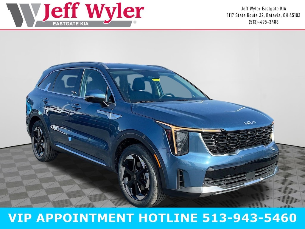 Priced below KBB Fair Purchase Price! Mineral Blue 2026 Kia Sorento Hybrid EX 1.6L Turbo GDI 4-Cylinder FWD 6-Speed Automatic 37/36 City/Highway MPG Jeff Wyler Eastgate Auto Mall is excited to offer this attractive-looking 2026 Kia Sorento Hybrid EX in Mineral Blue. Well equipped with: 3rd row seats: split-bench, 4-Wheel Disc Brakes, 6 Speakers, ABS brakes, Air Conditioning, All Weather Floor Mats, Alloy wheels, AM/FM radio: SiriusXM, Apple CarPlay & Android Auto, Auto High-beam Headlights, Auto-Dimming Mirror with HomeLink, Auto-dimming Rear-View mirror, Automatic temperature control, Brake assist, Bumpers: body-color, Delay-off headlights, Driver door bin, Driver vanity mirror, Dual front impact airbags, Dual front side impact airbags, Electronic Stability Control, Emergency communication system: 911 Connect, Exterior Parking Camera Rear, Four wheel independent suspension, Front anti-roll bar, Front Bucket Seats, Front Center Armrest, Front dual zone A/C, Front fog lights, Front reading lights, Fully automatic headlights, Heated door mirrors, Heated Front Bucket Seats, Heated front seats, Illuminated entry, Knee airbag, Leather steering wheel, Low tire pressure warning, Navigation System, Occupant sensing airbag, Outside temperature display, Overhead airbag, Overhead console, Panic alarm, Passenger door bin, Passenger vanity mirror, Power door mirrors, Power driver seat, Power Liftgate, Power passenger seat, Power steering, Power windows, Radio data system, Radio: AM/FM/SiriusXM Audio System, Rear anti-roll bar, Rear reading lights, Rear seat center armrest, Rear side impact airbag, Rear window defroster, Rear window wiper, Remote keyless entry, Security system, Speed control, Speed-sensing steering, Split folding rear seat, Spoiler, Steering wheel mounted audio controls, SynTex Artificial Leather Seat Trim, Tachometer, Telescoping steering wheel, Tilt steering wheel, Traction control, Trip computer, Turn signal indicator mirrors, Variably intermittent wipers, and Wheels: 19" Machine-Finished Aero Alloy. 37/36 City/Highway MPG Price includes: $2500 - Kia Customer Cash. Exp. 05/04/2026