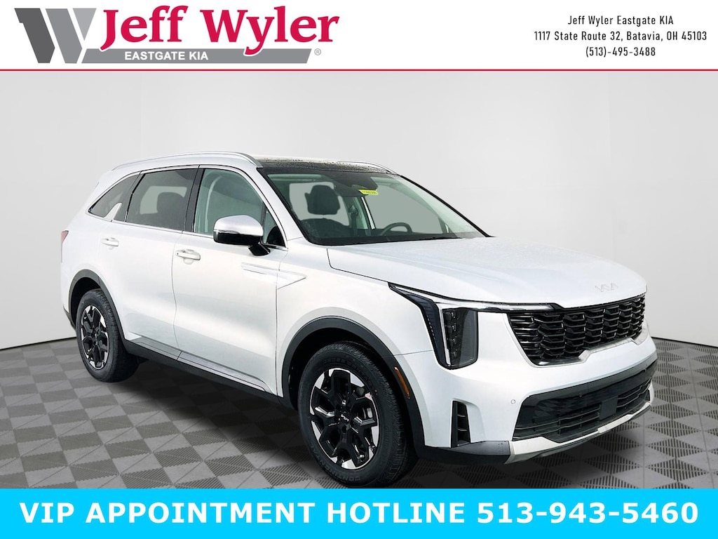 Ivory Silver 2026 Kia Sorento S 2.5L I4 DGI DOHC 16V LEV3-SULEV30 191hp FWD 8-Speed Automatic 23/31 City/Highway MPG Jeff Wyler Eastgate Auto Mall is excited to offer this beautiful 2026 Kia Sorento S in Ivory Silver. Well equipped with: S Panoramic Sunroof Package (Full-Length One-Touch Panoroof with Sliding Sunshade and LED Interior Lighting), 3rd row seats: split-bench, 4-Wheel Disc Brakes, 6 Speakers, ABS brakes, Air Conditioning, All Weather Floor Mats, Alloy wheels, AM/FM radio: SiriusXM, Apple CarPlay & Android Auto, Auto High-beam Headlights, Auto-Dimming Mirror with HomeLink, Automatic temperature control, Brake assist, Bumpers: body-color, Delay-off headlights, Driver door bin, Driver vanity mirror, Dual front impact airbags, Dual front side impact airbags, Electronic Stability Control, Emergency communication system: 911 Connect, Exterior Parking Camera Rear, Four wheel independent suspension, Front anti-roll bar, Front Bucket Seats, Front Center Armrest, Front dual zone A/C, Front reading lights, Fully automatic headlights, Heated door mirrors, Heated Front Bucket Seats, Heated front seats, Illuminated entry, Knee airbag, Leather Shift Knob, Leather steering wheel, Low tire pressure warning, Occupant sensing airbag, Outside temperature display, Overhead airbag, Overhead console, Panic alarm, Passenger door bin, Passenger vanity mirror, Power door mirrors, Power driver seat, Power steering, Power windows, Radio data system, Radio: AM/FM Standard Sound System, Rear anti-roll bar, Rear reading lights, Rear seat center armrest, Rear side impact airbag, Rear window defroster, Rear window wiper, Remote keyless entry, Security system, Speed control, Speed-sensing steering, Split folding rear seat, Spoiler, Steering wheel mounted audio controls, SynTex Artificial Leather Seat Trim, Tachometer, Telescoping steering wheel, Tilt steering wheel, Traction control, Trip computer, Turn signal indicator mirrors, Variably intermittent wipers, and Wheels: 18" Gloss Black Alloy. 23/31 City/Highway MPG Price includes: $2500 - Kia Customer Cash. Exp. 03/31/2026