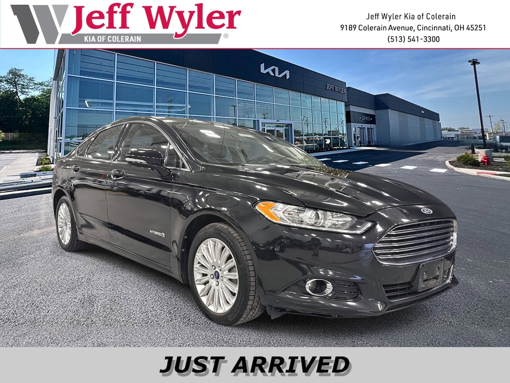Jeff Wyler Kia of Colerain is very proud to offer this great-looking 2013 Ford Fusion Hybrid SE in Tuxedo Black Metallic. Equipment Group 505A, Luxury Package (Electrochromic Exterior Mirrors, Electrochromic Rear-View Mirror, Fog Lamps, Heated Leather Front Bucket Seats, Leather Wrapped Gearshift Knob, and Leather-Wrapped Steering Wheel), SE Technology Package (110V Power Outlet, MyFord Touch w/SYNC, and Rear Video Camera), 17" Unique Aluminum Wheels, 4-Wheel Disc Brakes, 6 Speakers, ABS brakes, Active Park Assist w/Forward Sensing, Adaptive Cruise Control, Air Conditioning, Alloy wheels, AM/FM radio: SiriusXM, Automatic temperature control, Brake assist, Bumpers: body-color, CD player, Compass, Delay-off headlights, Driver door bin, Driver vanity mirror, Dual front impact airbags, Dual front side impact airbags, Eco Cloth Front Bucket Seats, Electronic Stability Control, Four wheel independent suspension, Front anti-roll bar, Front Bucket Seats, Front Center Armrest, Front dual zone A/C, Front License Plate Bracket, Front reading lights, Fully automatic headlights, Heated door mirrors, Illuminated entry, Knee airbag, Low tire pressure warning, Moonroof, Occupant sensing airbag, Outside temperature display, Overhead airbag, Overhead console, Panic alarm, Passenger door bin, Passenger vanity mirror, Power door mirrors, Power driver seat, Power steering, Power windows, Radio data system, Radio: AM/FM Stereo/Single CD/MP3 Capable/SYNC, Rear anti-roll bar, Rear reading lights, Rear seat center armrest, Rear window defroster, Remote keyless entry, Reverse Sensing System, Security system, Speed control, Speed-sensing steering, Speed-Sensitive Wipers, Split folding rear seat, Steering wheel mounted audio controls, Tachometer, Telescoping steering wheel, Tilt steering wheel, Traction control, Trip computer, Turn signal indicator mirrors, Universal Garage Door Opener, and Variably intermittent wipers Our PRE-OWNED vehicles are put through a rigorous 167- POINT QUALITY ASSURANCE INSPECTION along with an average amount of over $1,400.00 SPENT to recondition each vehicle so we can be sure to deliver you the highest quality vehicle like you deserve! ***ONLINE PRICE DOES NOT INCLUDE WYLER FAMILY FIRST PACKAGE***