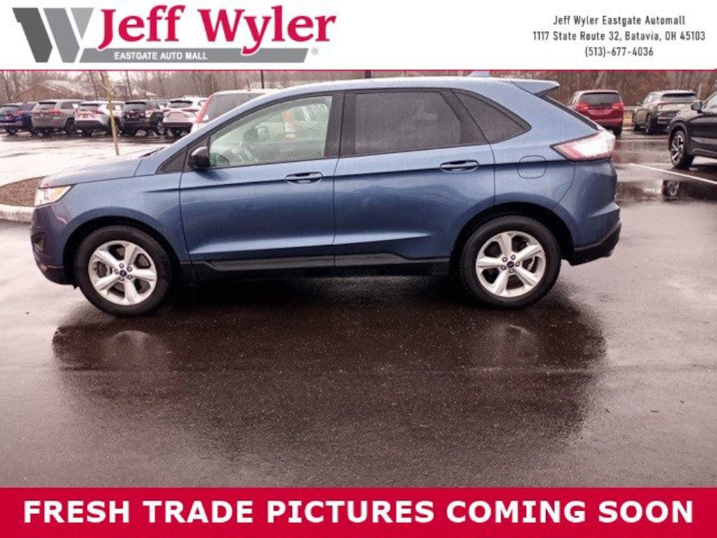 Jeff Wyler Eastgate Auto Mall is excited to offer this charming 2018 Ford Edge SE in Blue. Well equipped with: Equipment Group 100A, 3.36 Axle Ratio, 4-Wheel Disc Brakes, 6 Speakers, ABS brakes, Air Conditioning, Alloy wheels, AM/FM radio, AM/FM Stereo w/Single CD Player, Brake assist, Bumpers: body-color, CD player, Cloth Bucket Seats, Compass, Delay-off headlights, Driver door bin, Driver vanity mirror, Dual front impact airbags, Dual front side impact airbags, Electronic Stability Control, Emergency communication system: 911 Assist, Exterior Parking Camera Rear, Four wheel independent suspension, Front anti-roll bar, Front Bucket Seats, Front Center Armrest w/Storage, Front reading lights, Fully automatic headlights, Illuminated entry, Knee airbag, Leather Shift Knob, Low tire pressure warning, Occupant sensing airbag, Outside temperature display, Overhead airbag, Overhead console, Panic alarm, Passenger door bin, Passenger vanity mirror, Power door mirrors, Power steering, Power windows, Rear anti-roll bar, Rear reading lights, Rear seat center armrest, Rear window defroster, Rear window wiper, Remote keyless entry, Speed control, Speed-Sensitive Wipers, Split folding rear seat, Spoiler, Steering wheel mounted audio controls, SYNC Communications & Entertainment System, Tachometer, Telescoping steering wheel, Tilt steering wheel, Traction control, Trip computer, Variably intermittent wipers, and Wheels: 18" Sparkle Silver Painted Aluminum. Awards: * 2018 KBB.com Brand Image Awards * 2018 KBB.com 10 Most Awarded Brands Ask about available certifications. Used vehicles 10 years of age or newer with less than 100,000 miles are eligible for the Wyler Assurance Program, but eligible vehicles must pass our reconditioning process and multi-point inspection. Provided the vehicle passes inspection, vehicles will be eligible for the 6 month/6,000 mile limited warranty. The 6 month/6,000 mile limited warranty is NOT available on AS-IS vehicles, wholesale vehicles, lease buyback/pass-thru vehicles or un-inspected vehicles. Note that this program can also apply to vehicles where the remaining factory coverage is less than 6 months or 6,000 miles. Please check the Federal Trade Commission (FTC) Buyers guide on the vehicle for full details as to whether or not warranty coverage may apply. Contact Dealer for additional details. The Wyler Assurance 6 month/6,000 Mile limited warranty ends 6 months from the date of the Retail Purchase Agreement (BUYERS ORDER) or when the vehicle's odometer registers 6,000 additional miles to the mileage listed on the BUYERS ORDER, whichever comes first. Your Deductible - The warranty holder on your contract pays the first $100 of each covered repair.