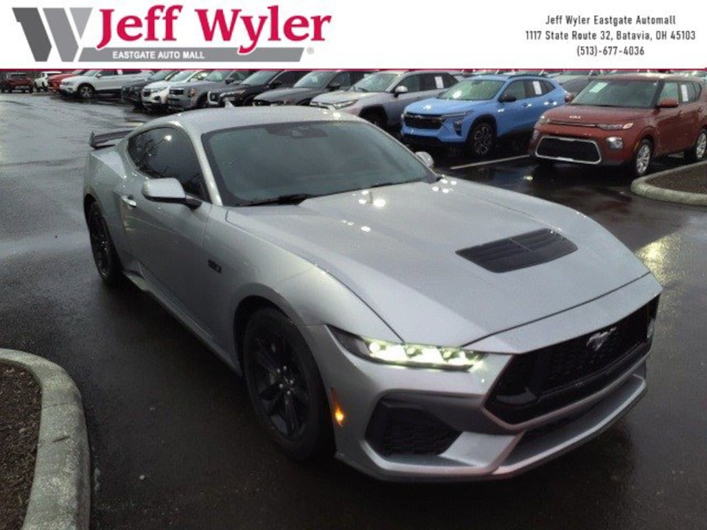 Jeff Wyler Eastgate Auto Mall is excited to offer this superb-looking 2024 Ford Mustang GT in Iconic Silver Metallic. Well equipped with: Equipment Group 301A High Package (9-Speaker Stereo System, Ambient Lighting w/MyColor, Dual-Zone Electronic Automatic Temperature Control, and SiriusXM w/360L & HD Radio), 4-Wheel Disc Brakes, 6 Speakers, ABS brakes, Active Valve Performance Exhaust, Air Conditioning, Alloy wheels, AM/FM radio, AM/FM Stereo, Auto High-beam Headlights, Automatic temperature control, Brake assist, Bumpers: body-color, Cloth Bucket Seats, Compass, Delay-off headlights, Driver door bin, Driver vanity mirror, Dual front impact airbags, Dual front side impact airbags, Electronic Stability Control, Emergency communication system: 911 Assist, Exterior Parking Camera Rear, Four wheel independent suspension, Front anti-roll bar, Front Bucket Seats, Front Center Armrest, Front reading lights, Fully automatic headlights, Illuminated entry, Knee airbag, Leather Shift Knob, Leather steering wheel, Low tire pressure warning, Occupant sensing airbag, Outside temperature display, Overhead airbag, Overhead console, Panic alarm, Passenger door bin, Passenger vanity mirror, Power door mirrors, Power steering, Power windows, Radio data system, Rain sensing wipers, Rear anti-roll bar, Rear Parking Sensors, Rear window defroster, Remote keyless entry, Speed control, Speed-sensing steering, Speed-Sensitive Wipers, Split folding rear seat, Spoiler, Sport steering wheel, Steering wheel mounted audio controls, SYNC 4.0 QNX, Tachometer, Telescoping steering wheel, Tilt steering wheel, Traction control, Trip computer, Variably intermittent wipers, Voltmeter, and Wheels: 18" x 8.5" Ebony Black Painted Aluminum. Clean CARFAX. Ask about available certifications. Used vehicles 10 years of age or newer with less than 100,000 miles are eligible for the Wyler Assurance Program, but eligible vehicles must pass our reconditioning process and multi-point inspection. Provided the vehicle passes inspection, vehicles will be eligible for the 6 month/6,000 mile limited warranty. The 6 month/6,000 mile limited warranty is NOT available on AS-IS vehicles, wholesale vehicles, lease buyback/pass-thru vehicles or un-inspected vehicles. Note that this program can also apply to vehicles where the remaining factory coverage is less than 6 months or 6,000 miles. Please check the Federal Trade Commission (FTC) Buyers guide on the vehicle for full details as to whether or not warranty coverage may apply. Contact Dealer for additional details. The Wyler Assurance 6 month/6,000 Mile limited warranty ends 6 months from the date of the Retail Purchase Agreement (BUYERS ORDER) or when the vehicle's odometer registers 6,000 additional miles to the mileage listed on the BUYERS ORDER, whichever comes first. Your Deductible - The warranty holder on your contract pays the first $100 of each covered repair.