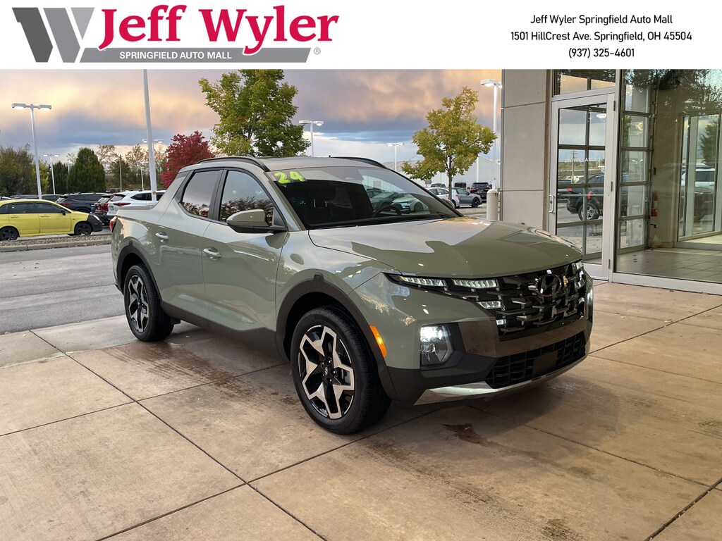 Jeff Wyler Springfield Auto Mall is pleased to offer this wonderful-looking 2024 Hyundai Santa Cruz Limited in Sage Gray. Well equipped with: Option Group 01, 3.316 Axle Ratio, 4-Wheel Disc Brakes, 8 Speakers, ABS brakes, Air Conditioning, Alloy wheels, AM/FM radio: SiriusXM, Apple CarPlay & Android Auto, Auto High-beam Headlights, Auto-dimming Rear-View mirror, Auto-leveling suspension, Automatic temperature control, Bed Cargo Net, Bed Mat, Brake assist, Bumpers: body-color, Carpeted Floor Mats, Delay-off headlights, Driver door bin, Driver vanity mirror, Dual front impact airbags, Dual front side impact airbags, Electronic Stability Control, Emergency communication system: Bluelink+, Exterior Parking Camera Rear, First Aid Kit, Four wheel independent suspension, Front anti-roll bar, Front Bucket Seats, Front Center Armrest, Front dual zone A/C, Front reading lights, Fully automatic headlights, Garage door transmitter: HomeLink, Heated & Ventilated Front Bucket Seats, Heated door mirrors, Heated front seats, Heated steering wheel, Illuminated entry, Leather Shift Knob, Leather steering wheel, Leather-Trimmed Seats, Low tire pressure warning, Navigation System, Occupant sensing airbag, Outside temperature display, Overhead airbag, Overhead console, Panic alarm, Passenger door bin, Passenger vanity mirror, Power door mirrors, Power driver seat, Power moonroof, Power steering, Power windows, Radio data system, Radio: AM/FM/HD w/Bose Premium Audio System, Rain sensing wipers, Rear anti-roll bar, Rear side impact airbag, Rear step bumper, Rear window defroster, Remote keyless entry, Roadside Assistance Kit, Security system, Speed control, Speed-sensing steering, Split folding rear seat, Spoiler, Steering wheel mounted audio controls, Tachometer, Telescoping steering wheel, Tilt steering wheel, Traction control, Trip computer, Turn signal indicator mirrors, Variably intermittent wipers, Ventilated front seats, and Wheels: 20" x 7.5J Alloy. Ask about available certifications. Used vehicles 10 years of age or newer with less than 100,000 miles are eligible for the Wyler Assurance Program, but eligible vehicles must pass our reconditioning process and multi-point inspection. Provided the vehicle passes inspection, vehicles will be eligible for the 6 month/6,000 mile limited warranty. The 6 month/6,000 mile limited warranty is NOT available on AS-IS vehicles, wholesale vehicles, lease buyback/pass-thru vehicles or un-inspected vehicles. Note that this program can also apply to vehicles where the remaining factory coverage is less than 6 months or 6,000 miles. Please check the Federal Trade Commission (FTC) Buyers guide on the vehicle for full details as to whether or not warranty coverage may apply. Contact Dealer for additional details. The Wyler Assurance 6 month/6,000 Mile limited warranty ends 6 months from the date of the Retail Purchase Agreement (BUYERS ORDER) or when the vehicle's odometer registers 6,000 additional miles to the mileage listed on the BUYERS ORDER, whichever comes first. Your Deductible - The warranty holder on your contract pays the first $100 of each covered repair.