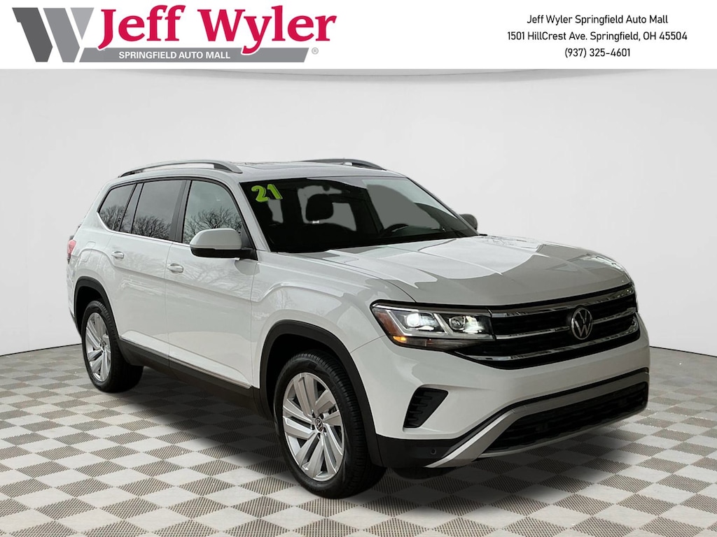 Jeff Wyler Springfield Auto Mall is delighted to offer this good-looking 2021 Volkswagen Atlas SEL in White. Well equipped with: 3.60 Axle Ratio, 3rd row seats: split-bench, 4-Wheel Disc Brakes, 6 Speakers, ABS brakes, Air Conditioning, Alloy wheels, Auto High-beam Headlights, Auto-dimming Rear-View mirror, Automatic temperature control, Brake assist, Bumpers: body-color, Compass, Delay-off headlights, Driver door bin, Driver vanity mirror, Dual front impact airbags, Dual front side impact airbags, Electronic Stability Control, Emergency communication system: VW Car-Net services (capabilities require enrollment or subscription), Exterior Parking Camera Rear, Four wheel independent suspension, Front anti-roll bar, Front Bucket Seats, Front Center Armrest, Front dual zone A/C, Front fog lights, Front reading lights, Fully automatic headlights, Heated Comfort Front Bucket Seats, Heated door mirrors, Heated front seats, Heated steering wheel, Illuminated entry, Leather Shift Knob, Low tire pressure warning, Memory seat, Navigation System, Occupant sensing airbag, Outside temperature display, Overhead airbag, Overhead console, Panic alarm, Passenger door bin, Passenger vanity mirror, Perforated V-Tex Leatherette Seating Surfaces, Power door mirrors, Power driver seat, Power Liftgate, Power moonroof, Power passenger seat, Power steering, Power windows, Radio data system, Rain sensing wipers, Rear air conditioning, Rear anti-roll bar, Rear reading lights, Rear seat center armrest, Rear window defroster, Rear window wiper, Remote keyless entry, Roof rack: rails only, Security system, Speed control, Speed-sensing steering, Split folding rear seat, Spoiler, Standard Suspension, Steering wheel mounted audio controls, Tachometer, Telescoping steering wheel, Tilt steering wheel, Traction control, Trip computer, Turn signal indicator mirrors, Variably intermittent wipers, and Wheels: 20" 5-Spoke Silver Alloy. Ask about available certifications. Used vehicles 10 years of age or newer with less than 100,000 miles are eligible for the Wyler Assurance Program, but eligible vehicles must pass our reconditioning process and multi-point inspection. Provided the vehicle passes inspection, vehicles will be eligible for the 6 month/6,000 mile limited warranty. The 6 month/6,000 mile limited warranty is NOT available on AS-IS vehicles, wholesale vehicles, lease buyback/pass-thru vehicles or un-inspected vehicles. Note that this program can also apply to vehicles where the remaining factory coverage is less than 6 months or 6,000 miles. Please check the Federal Trade Commission (FTC) Buyers guide on the vehicle for full details as to whether or not warranty coverage may apply. Contact Dealer for additional details. The Wyler Assurance 6 month/6,000 Mile limited warranty ends 6 months from the date of the Retail Purchase Agreement (BUYERS ORDER) or when the vehicle's odometer registers 6,000 additional miles to the mileage listed on the BUYERS ORDER, whichever comes first. Your Deductible - The warranty holder on your contract pays the first $100 of each covered repair.